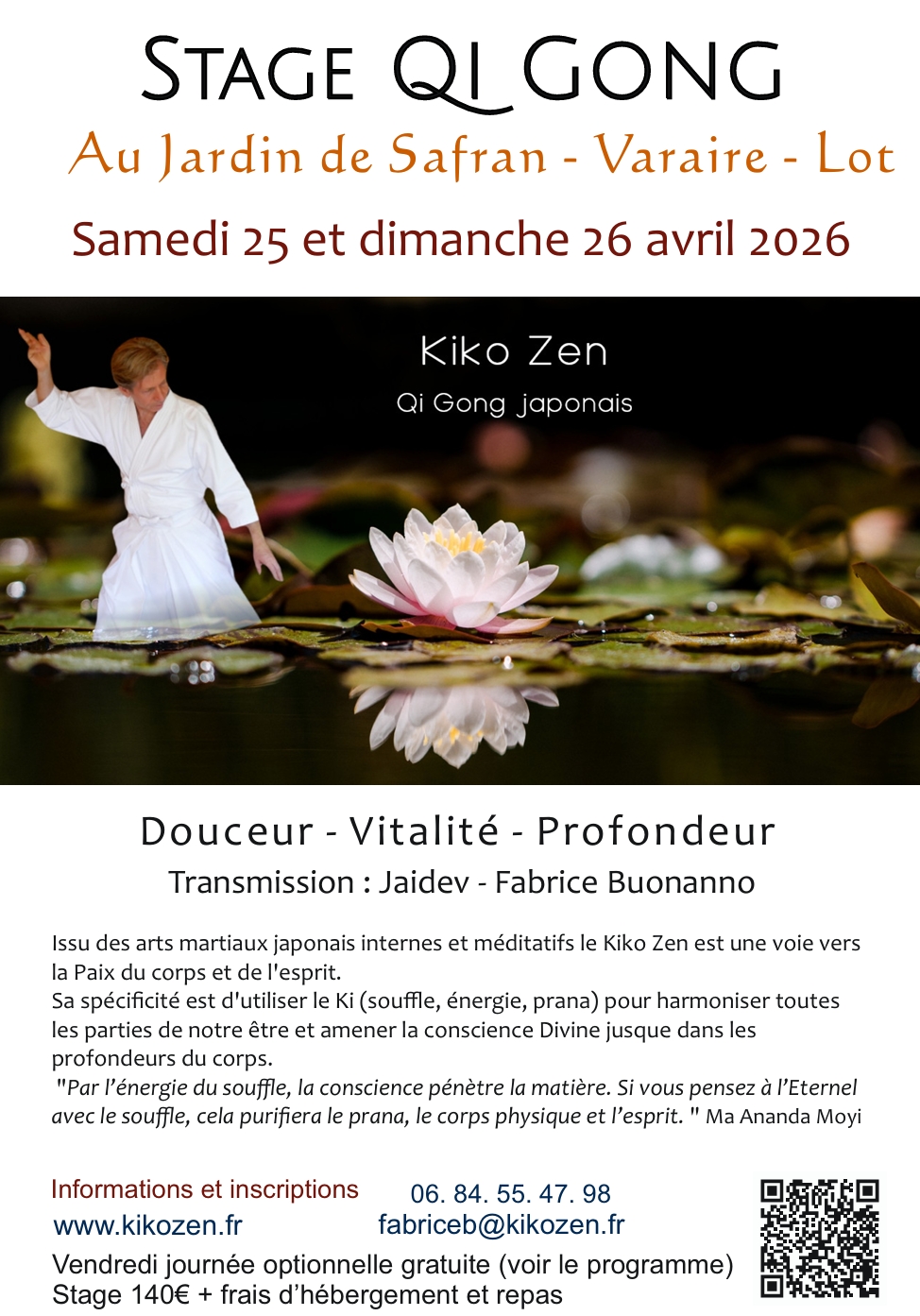 Stage de Qi Gong Japonais Animé par Jaidev Du samedi 25 avril au dimanche 26 avril 2026 Télécharger le bulletin d'inscription